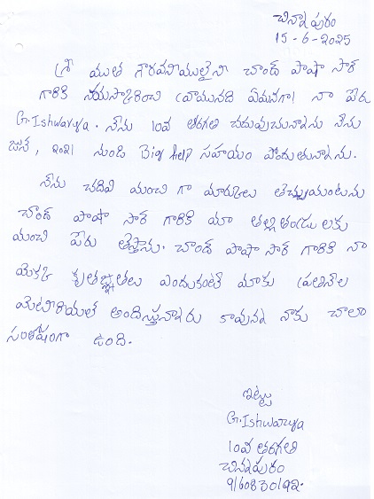 Bighelp thanks Laxmi Mehrotra for kindly sponsoring the education of Iswarya Gobattina. |