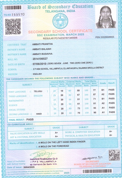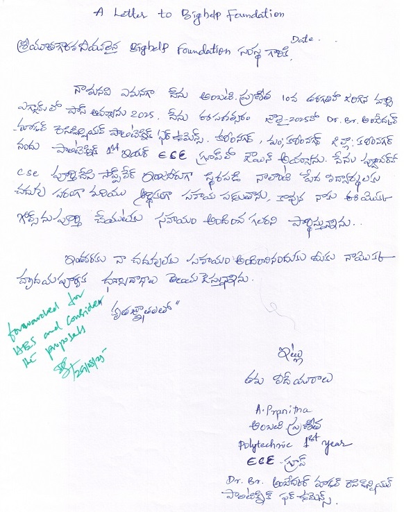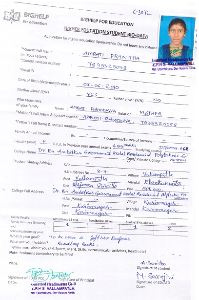 Bighelp thanks Vipul N Panchal for kindly sponsoring the education of Pranitha Ambati. |