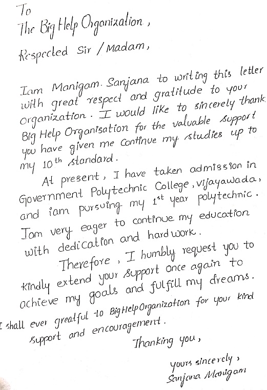 Bighelp thanks Venkata Suresh Alapati for kindly sponsoring the education of Sanjana Manigam. |