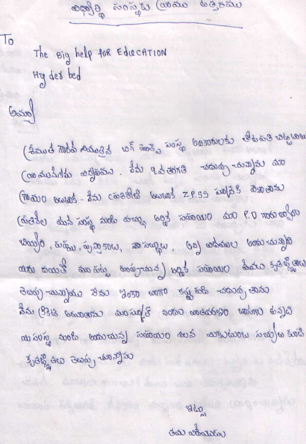 | Bighelp thanks Madhu Sheela for kindly sponsoring the education of Chittibabu Thotapalli. |
