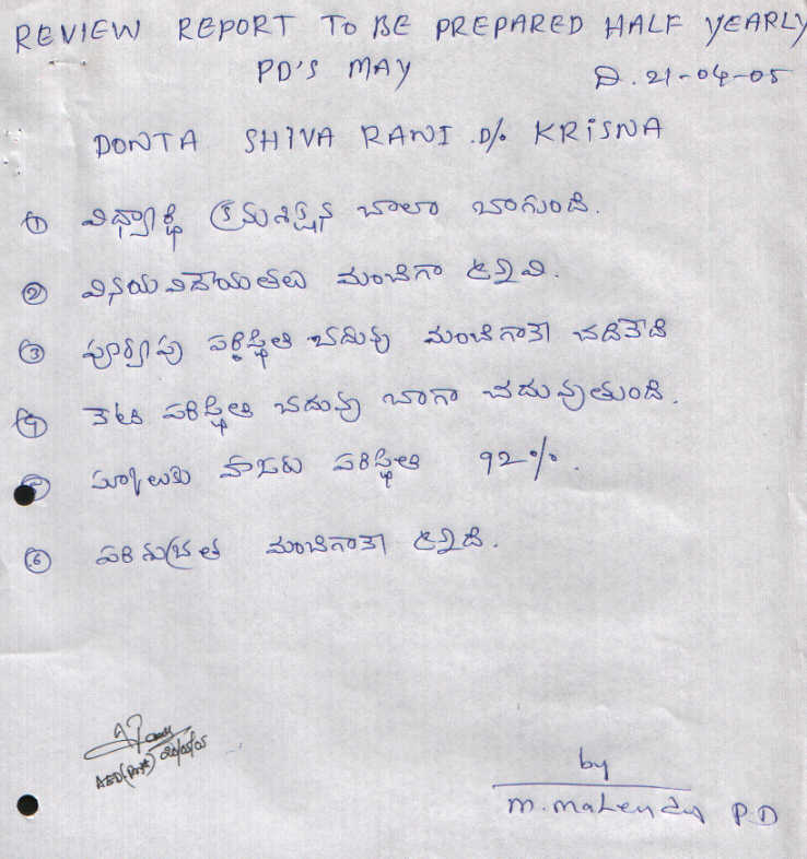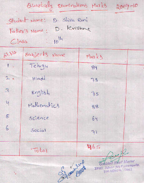 | Shiva Rani Donta was asked to perform at least TEN PERCENT increase in the academic marks (until minimum 60 percent is obtained in every subject) every year to be eligible to continue the sponsorship in following year. |