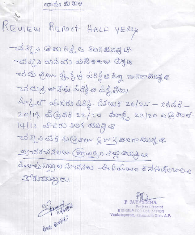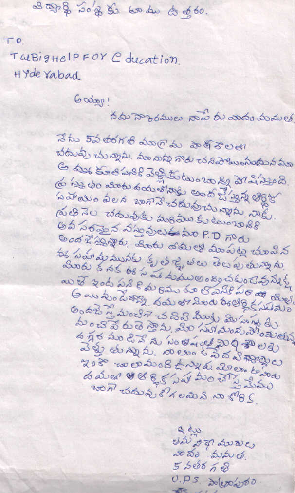 | Mamatha Vadam was asked to perform at least TEN PERCENT increase in the academic marks (until minimum 60 percent is obtained in every subject) every year to be eligible to continue the sponsorship in following year. |