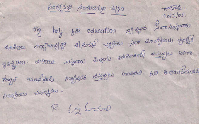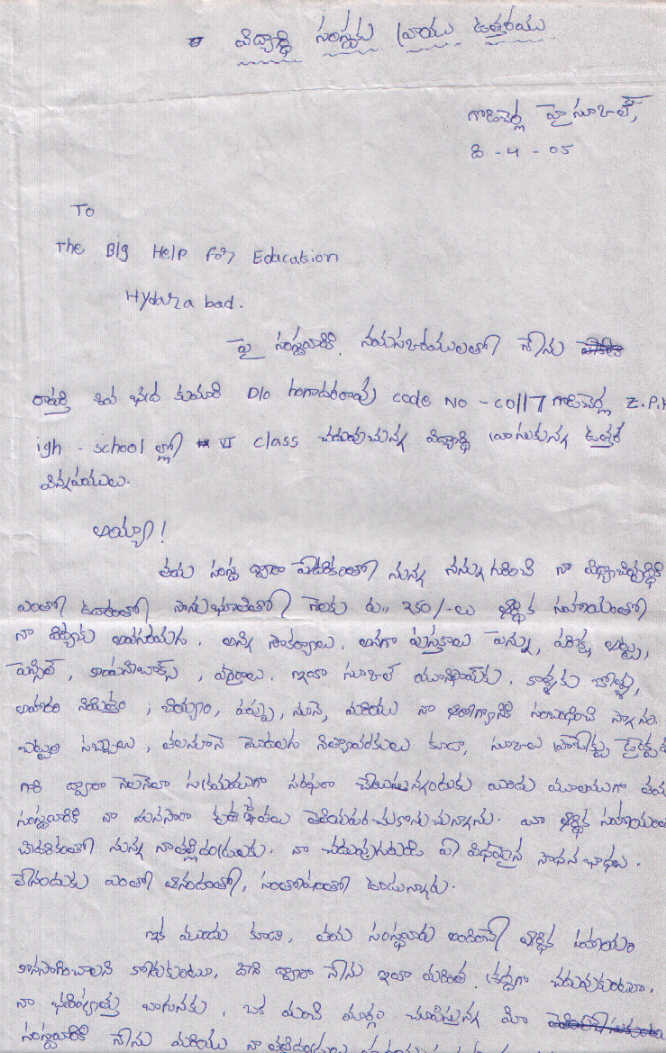 | Bighelp thanks Deepak Wadhwa for kindly sponsoring the education of Shiva Bhadra Kumari Raparthi. |
