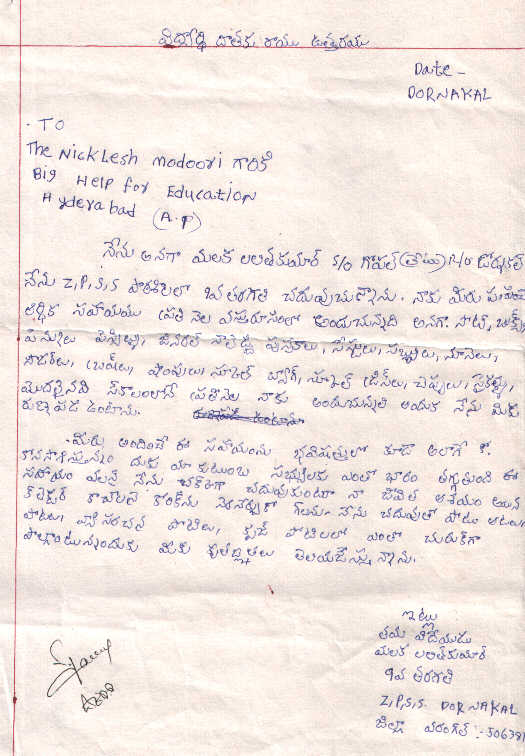 | Bighelp thanks Nicklesh Madoori for kindly sponsoring the education of Lalith Kumar Malaka. |