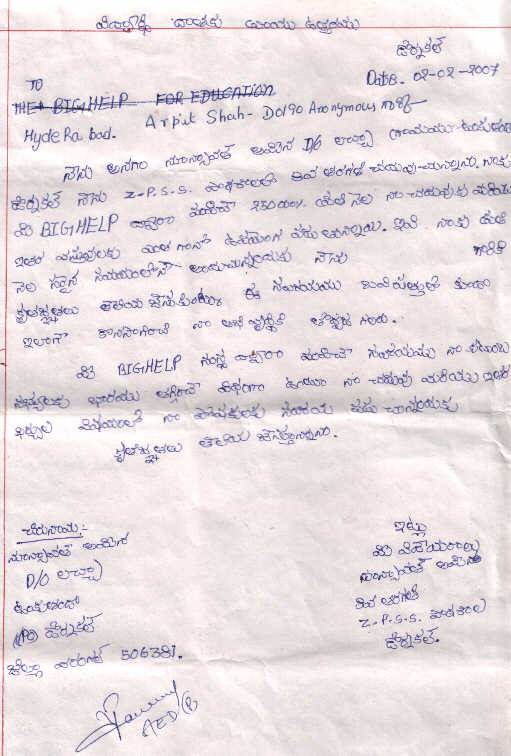 | Bighelp thanks Subu M Kota for kindly sponsoring the education of Nunsavat Ameena. |