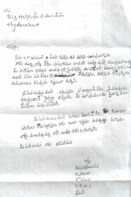 | Bighelp thanks Sathya Maram for kindly sponsoring the education of Nagaraju Manikireddy. |