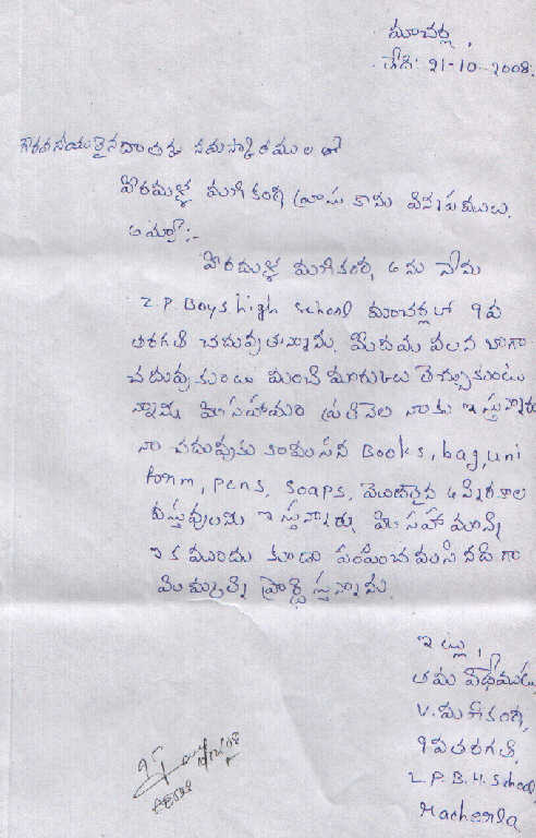 Bighelp sponsored Maninkanta when he was studying 8th class in 2007. At the beginning he was an above average student but financially very poor and about to discontinue his studies. Bighelp project committee working in his village determined that Manikanta would be benefited if they provide him the necessary guidance and make him focus on his studies by sponsoring his education under sponsor-a-child program. There after they took all necessary steps to improve his caliber. All the sincere efforts and hard work of our project committee has paid off when they see Manikanta passed 10th Grade with a total marks 549 (91.5%) in public examination during the academic year 2009-10.