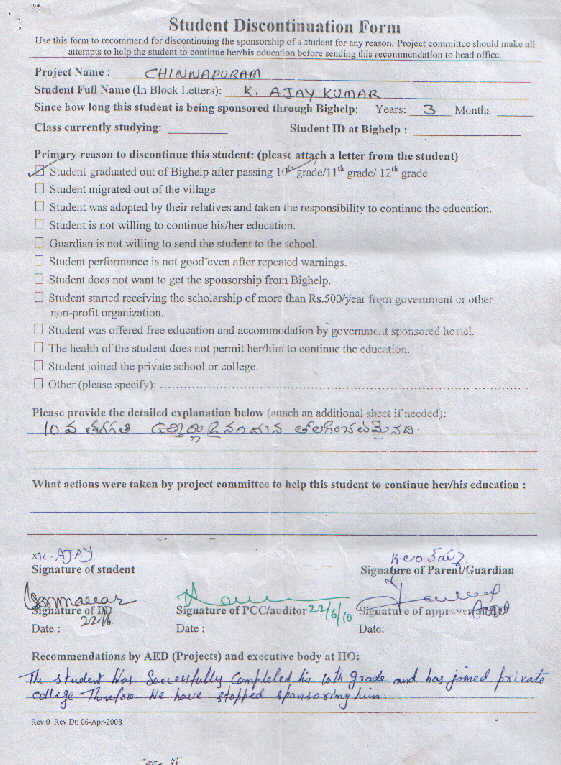| Bighelp thanks Kishore and Shravani Macha for kindly sponsoring the education of Ajay Kumar Kollabathina. |