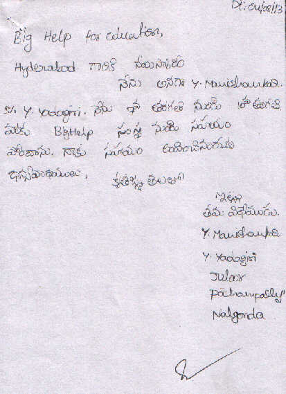 | Bighelp thanks Gopal Rajanala for kindly sponsoring the education of Manishankar Yakiri. |