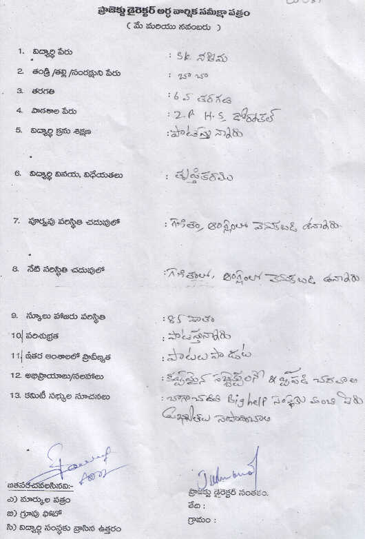 | Executive committee members USA and India talked with Nazeema Shaik during voice conference on 22nd November 2014. They enquired about her education and family welfare. She said that the Project director provided tuition. The tutor is taking utmost care to the Bighelp students. Executive Committee advised her to study well and get good marks in future |