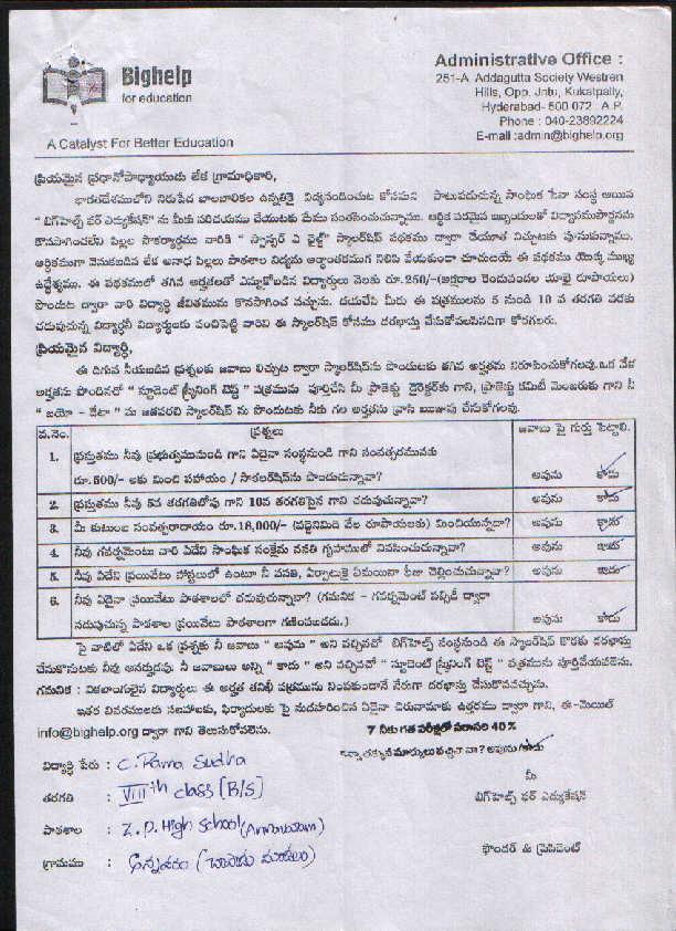 | Bighelp thanks Kameswararao Chivukula for kindly sponsoring the education of Ramasudha Challa. |