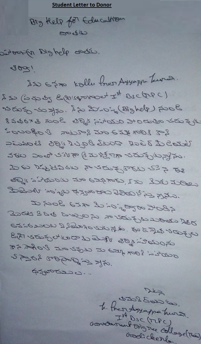 | Bighelp thanks Lakshmi Vemuri for kindly sponsoring the education of Prema Ayyappa Kumar Kolli. |