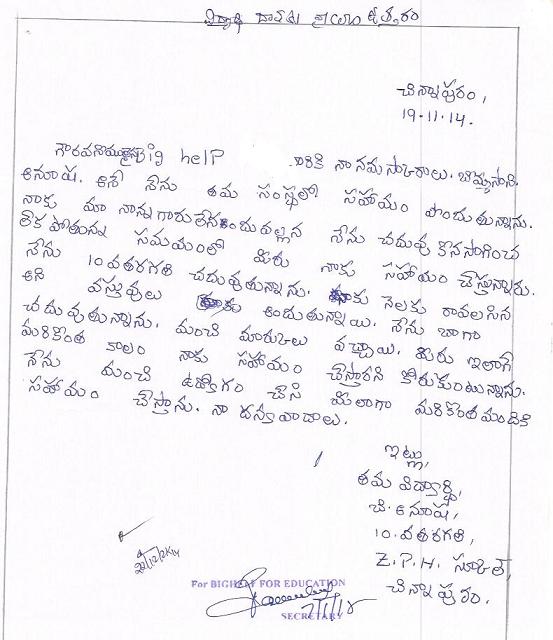 | Bighelp thanks Nikhil Chintalapudi for kindly sponsoring the education of Anusha Bommasani. |