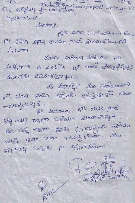| Bighelp thanks Nanditha Gade for kindly sponsoring the education of Akhila Godari. |