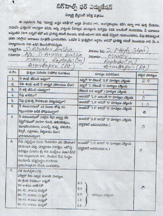 | Secretary has talked with Khaderbasha Shaik over phone on 24th June 2013. He enquired about his education and attendance. Secretary warned him to show more improvement in education and attend the school regularly. |