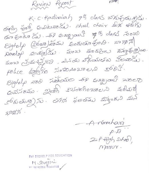| Bighelp thanks Suneetha & Suman Vijayapuram for kindly sponsoring the education of Chinna Kadiraiah Kadithi. |
