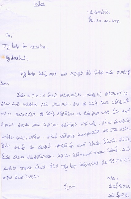 | Bighelp thanks Kumar Kanteti for kindly sponsoring the education of Poojitha Siddavarapu . |