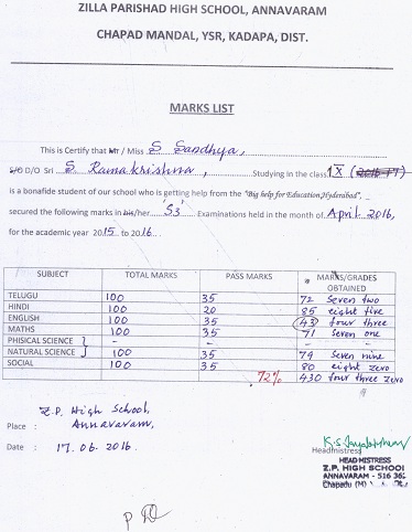 | Bighelp thanks Bhanu kumar Avadootha for kindly sponsoring the education of Sandya Settipalli . |
