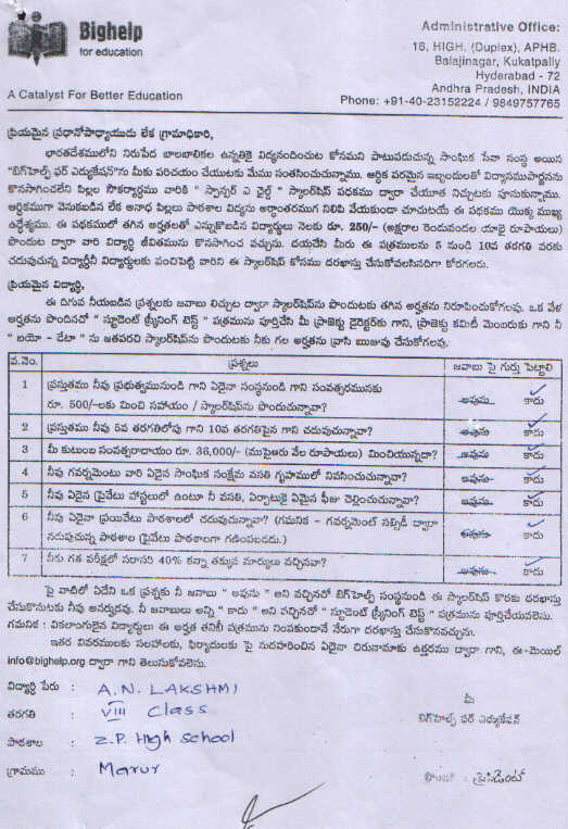 Lakshmi Analu Nadipi has no mother. Her father is working as a daily laborer and not taking care of the family. Hence Lakshmi is at the edge of discontinuing her studies. At the time she approached Bighelp with request for support she was studying 9th class and got 61% marks in 8th grade. She promised Bighelp to study well if she gets the support. Hence Bighelp is supporting to complete her education.