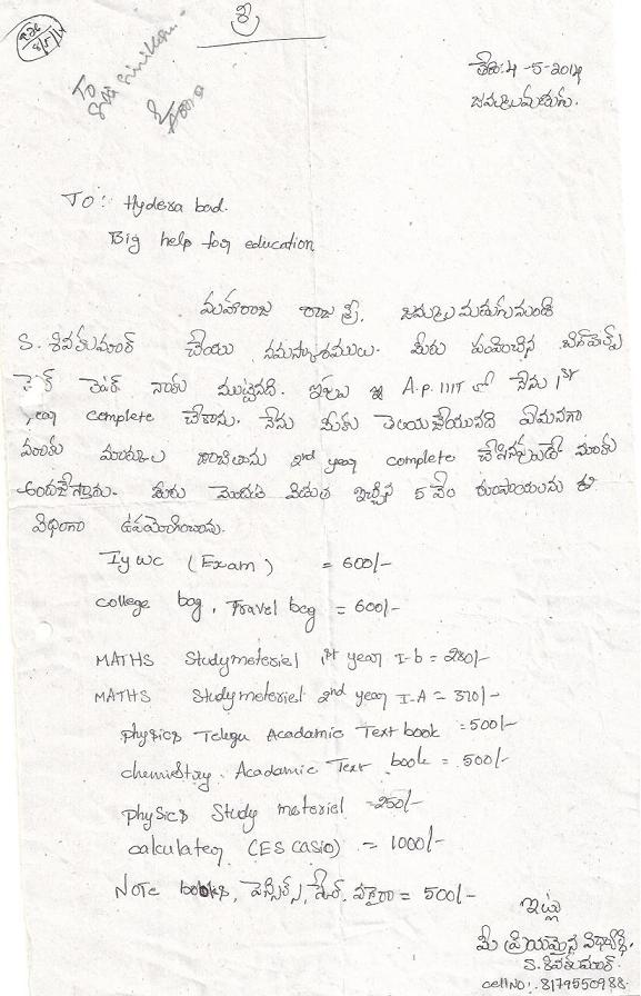 | Bighelp thanks Bhuvan Sunkara for kindly sponsoring the education of Siva Kumar Soma . |