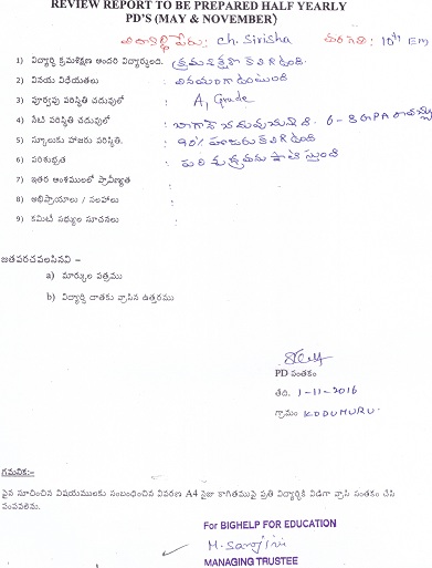 | Mr. Vishnu talked with Shirisha Chittimodu on 27th January 2017. He reviewed performance and made suggestions to get good marks in SSC Public examinations. He informed that Bighelp will continue her sponsorship in the Intermediate if he gets good marks in SSC public examinations. He also enquired about the list of items being provided by project director every month. He asked about family status and personal problems being faced by Shirisha. |