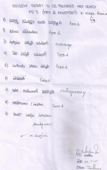 | Mr. Srinivasa Rao AED (Projects) talked with Naga Ratnam Rayudu on 27th December 2016. He reviewed performance and made suggestions to get good marks in all subjects. He also enquired about the list of items being provided by project director every month. He asked about family status and personal problems being faced by Naga Ratnam. |