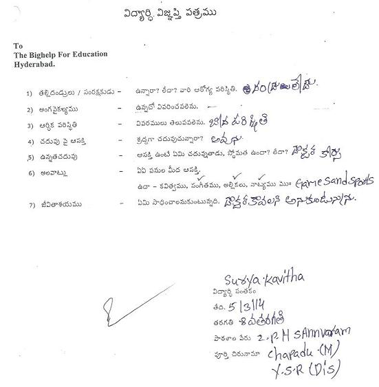 Bighelp thanks Vijetha Potharla for kindly sponsoring the education of Kavitha Surya.