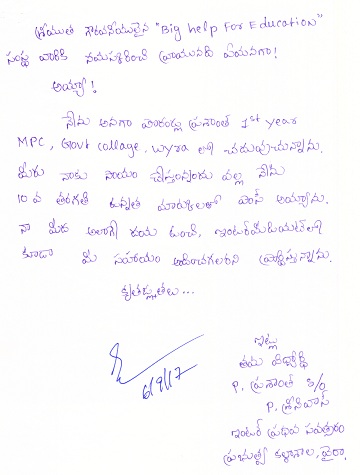 | Bighelp thanks Basaveshwar Gunda for kindly sponsoring the education of Prashanth Poralla. |