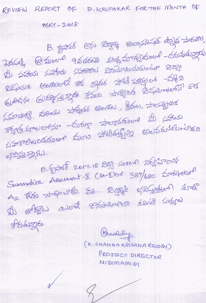 | Mr. Srinivasa Rao A.E.D. (Projects) talked with Krupakar Bhimaneni on 20th December 2016. He reviewed performance and made suggestions to improve in all subjects. He also enquired about the list of items being provided by project director every month. He asked about family status and personal problems being faced by Krupakar.
