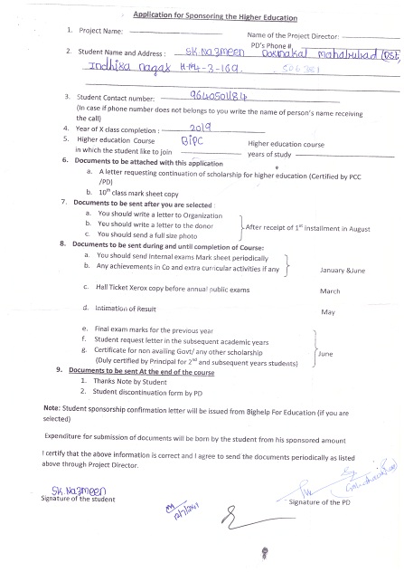 | Bighelp thanks Raja & Sailaja Tummla for kindly sponsoring the education of Nazmeen Shaik. |
