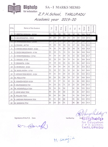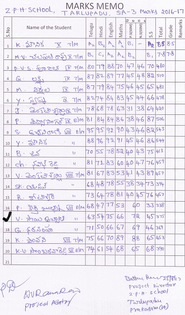 | Mr. Vishnu talked with Sai Atchutha Vedela on 07th February 2017. He reviewed performance and made suggestions to improve in all subjects. He enquired about the list of items being provided by project director every month. He asked about family status and personal problems being faced by Sai Atchutha. |