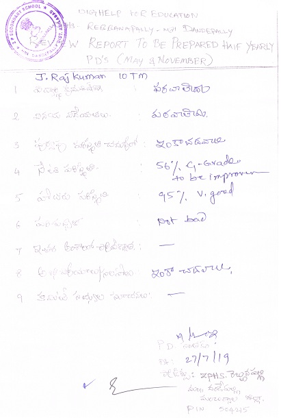 | Mr. Srinivasa Rao AED (Projects) talked with Raj Kumar Jadi on 8th February 2017. He reviewed performance and made suggestions to get good marks in Maths and Hindi subjects. He also enquired about the list of items being provided by project director every month. He asked about family status and personal problems being faced by Raj Kumar. |