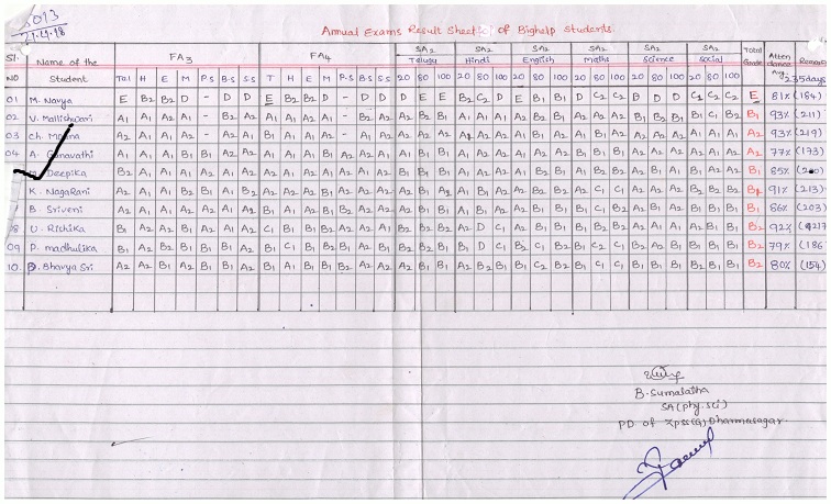 | Mrs. Sirisha talked with Deepika Madishetti on 23rd December 2016. She reviewed performance and made suggestions to improve in all subjects. She also enquired about the list of items being provided by project director every month. She asked about family status and personal problems being faced by Deepika. |