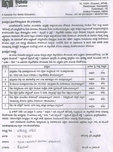 | Bighelp thanks Sharath Chandra Samudrala for kindly sponsoring the education of Deepika Madishetti. |