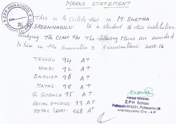 | Mr. Srinivasa Rao A.E.D. (Projects) talked with Swetha Medasani on 20th December 2016. He reviewed performance and made suggestions to get good marks in future examinations also. He enquired about the list of items being provided by project director every month. He asked about family status and personal problems being faced by Swetha. |
