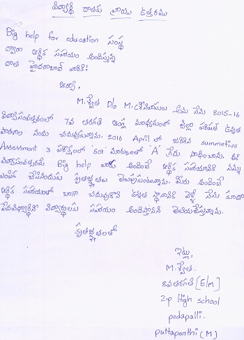 | Bighelp thanks Nihar Gudiseva for kindly sponsoring the education of Swetha Medasani. |