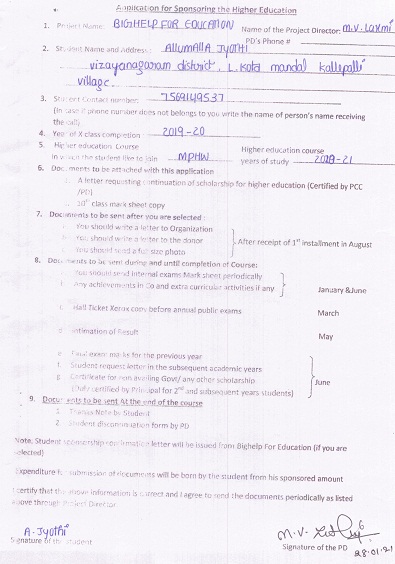 | Bighelp thanks Priyanka Pradhan for kindly sponsoring the education of Jyothi Allumalla. |