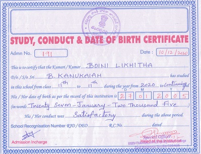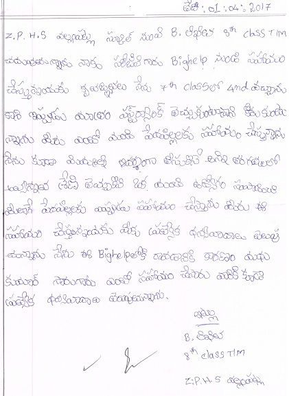 | Mr.Vishnu Vardhan Reddy, talked with Likhitha Boini on 22nd December 2016. Reviewed performance and made suggestions to improve in Science and English subjects. He also inquired about the list of items being distributed in every month. He asked about family status and personal problems being faced by Likhitha. |