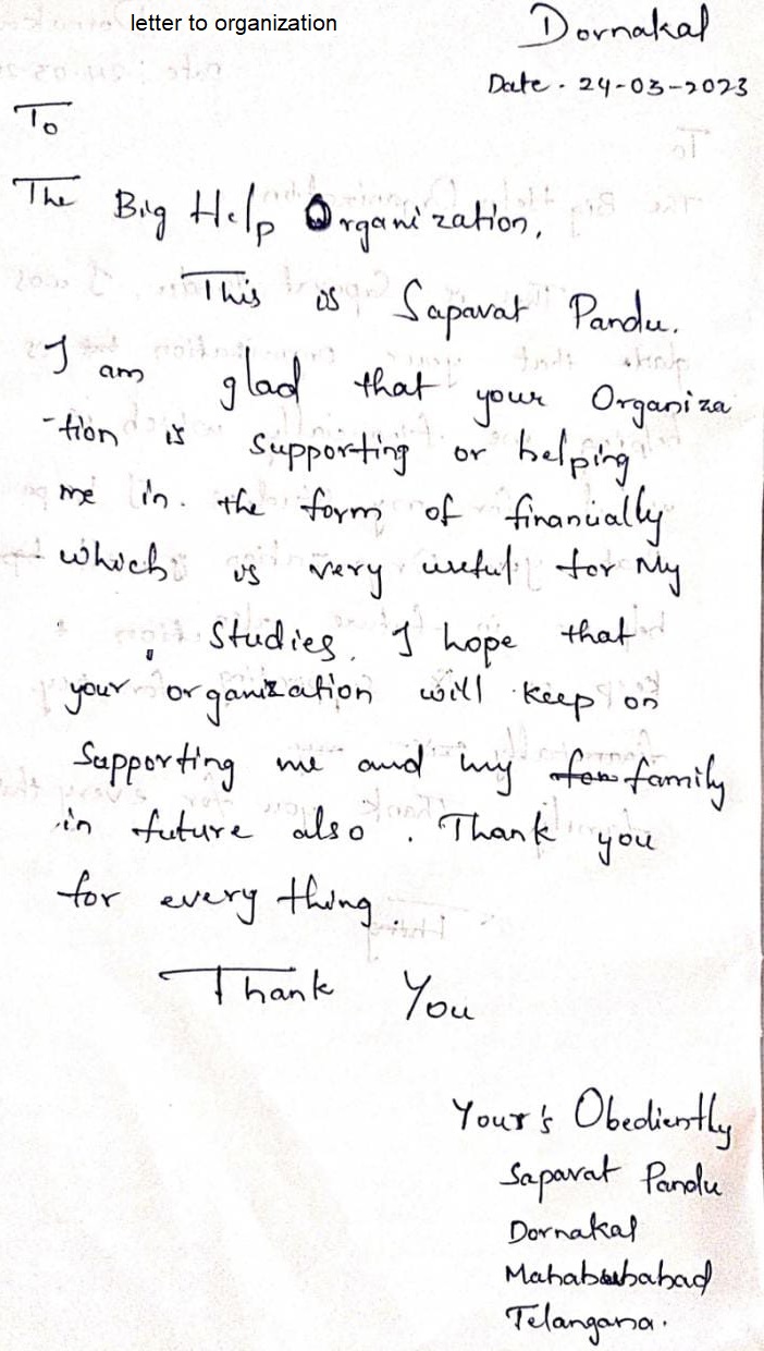 | Bighelp thanks Sharath Chandra Samudrala for kindly sponsoring the education of Pandu Sapavath. |