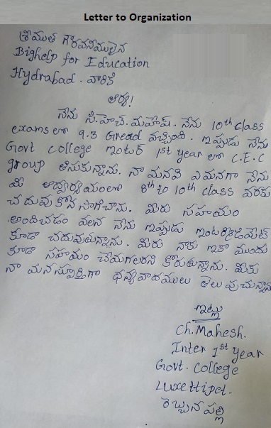 | Bighelp thanks Bhargavkumar Donga for kindly sponsoring the education of Mahesh Chelimala. |