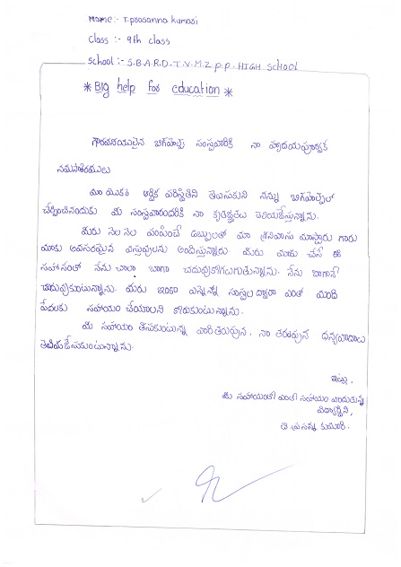 | Bighelp thanks Uma Maheswara Reddy for kindly sponsoring the education of Prasanna Kumari Thiramsetty. |