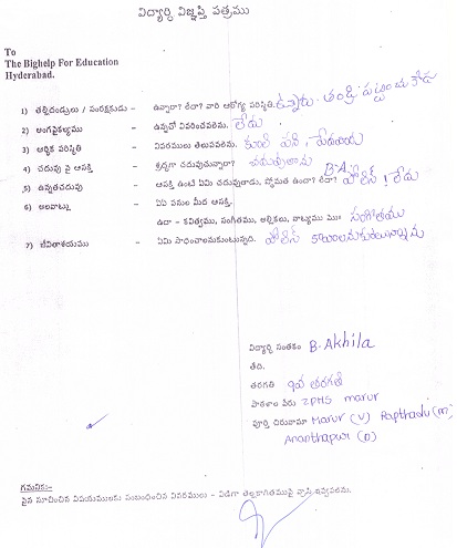 | Bighelp thanks Samatha & Ganesh Perumalla for kindly sponsoring the education of Akhila Budaga. |