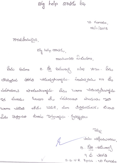 | Bighelp thanks Lokesh Reddy for kindly sponsoring the education of Keerthi Amulya Budi. |