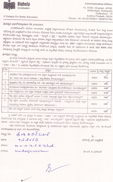 | Bighelp thanks Sirisha Kavuri for kindly sponsoring the education of Dileep Kumar Grandhi. |