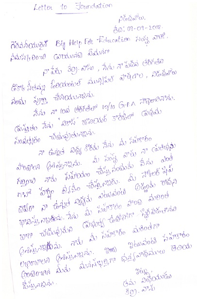 | Bighelp thanks Lavanya Pasupuleti for kindly sponsoring the education of Vasu Karri. |