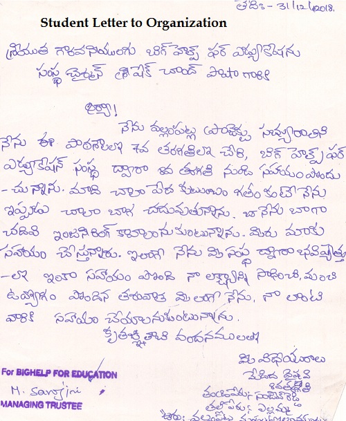 | Bighelp thanks Srimani Alaham for kindly sponsoring the education of Vaishnavi Medidha. |