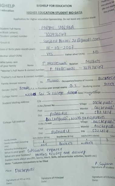 | Bighelp thanks Gayatridevi and Ravi Ika for kindly sponsoring the education of Sanjana Parimi. |