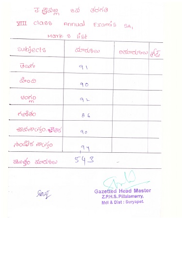 | Srivalli Jerripothula has passed 10th grade with 8.2 GPA on