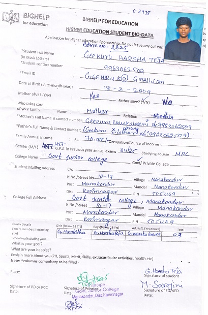 Bighelp thanks Srilu Kishore for kindly sponsoring the education of Harsha Teja Geekuru. |