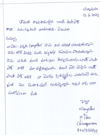 Bighelp thanks Vamshi Bommavaram for kindly sponsoring the education of Gayathri Vadladi. |